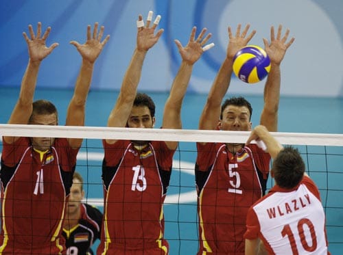From left, German setter Frank Dehne Stefan, middle blocker Ralph Bergman and wing spiker Bjorn Andrae defend against Poland's Mariusz Wlazly during a preliminary men's volleyball match against Poland at the Beijing.