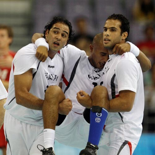 Egypt's Belal Mabrouk is carried by his teammates after injuring himself against Denmark during their men's handball preliminary match in Beijing.