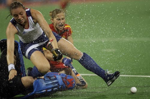 Great Britain's Kate Walsh, left falls during a women's field hockey match against Germany in Beijing.