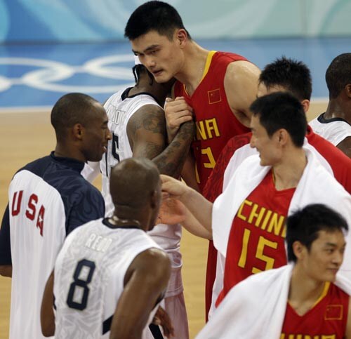 Team USA forward Carmelo Anthony, second from left, and China center Yao Ming greet each other as their teams' shake hands after the USA won their preliminary basketball game 101-70 in Beijing.