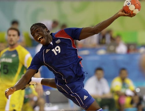 France's Luc Abalo shoots for a goal as Brazil's Carlos Ertel looks on during their men's handball preliminary match in Beijing.