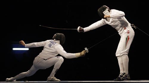 Fabrice Jeannet of France, left, and Gabor Boczko of Hungary compete at the semifinals of the men's fencing individual epee event at the Beijing 2008 Olympics in Beijing.
