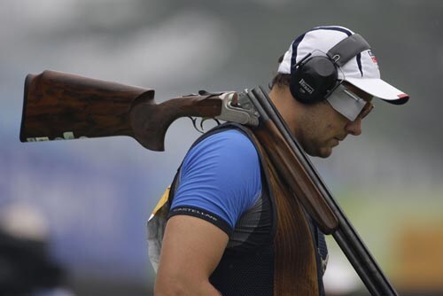 David Kostelecky, of the Czech Republic, waits for the men's trap final to begin at the Beijing 2008 Olympics in Beijing.