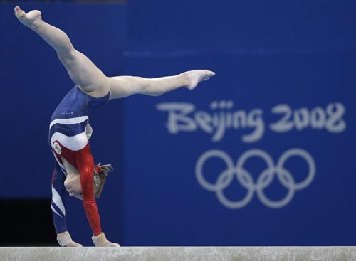 Greece's gymnast Stefani Bismpikou performs on the balance beam during the women's qualification rounds at the Beijing 2008 Olympics in Beijing.