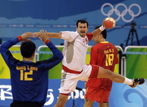 Poland's Pavel Piwko, center, goes to shoot on China goalkeeper Long Wang during preliminary men's handball action at the Beijing 2008 Olympics in Beijing.