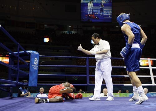 Bradley Saunders of Great Britain, right, knocks out Samuel Kotey Neequaye of Ghana during a Men's Light Welter weight 64kg preliminary boxing match in Beijing.