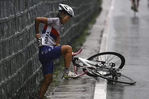 Sungeun Gu of South Korea gets back to her feet after falling during the women's road cycling race in Beijing. Britain's Nicole Cooke won the event..