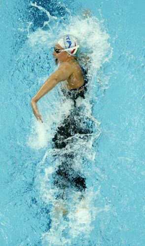 Italy's Federica Pellegrini swims in a women's 400-meter freestyle heat during the swimming competitions in the National Aquatics Center in Beijing.