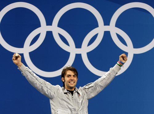 Italy's Matte Tagliariol jumps into the crowd after beating Fabrice Jeannet of France during the gold medal round of the men's fencing individual epee in Beijing.
