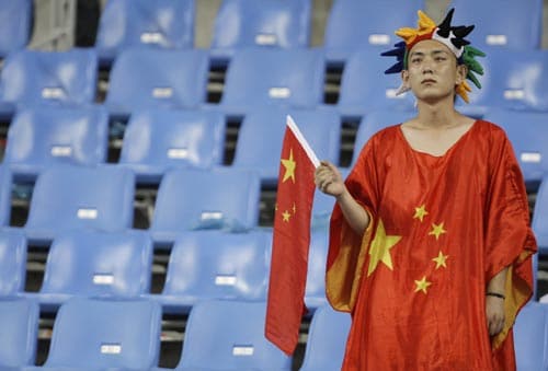 A Chinese soccer fan holds China's flag as he looks on at the end of the China against Belgium men's Group C, first round soccer match at the Beijing 2008 Olympics in Shenyang, northeastern China's Liaoning province.