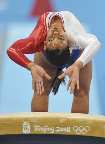 France's gymnast Rose-Eliandre Bellemare performs on the vault during the women's qualification rounds at the Beijing 2008 Olympics in Beijing.