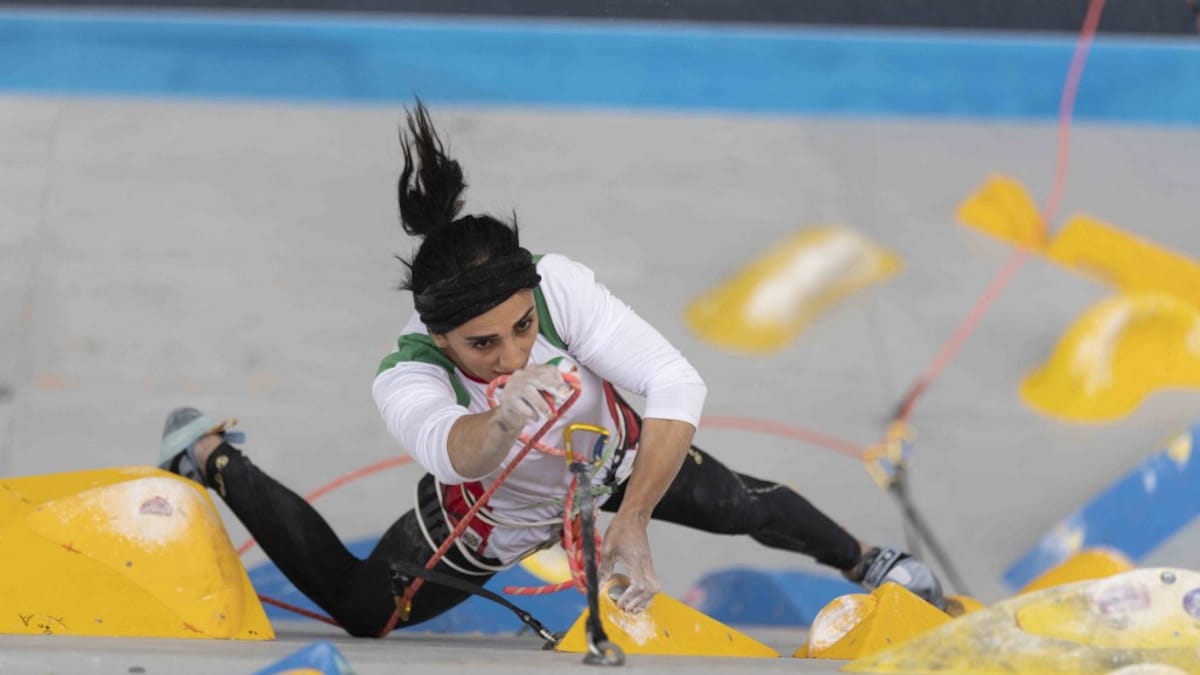 In the initial bouldering discipline her head was covered with a bandana but in the later lead climbing, scaling a high wall with a rope, she wore only a headband, the stream posted by the International Federation of Sport Climbing showed.