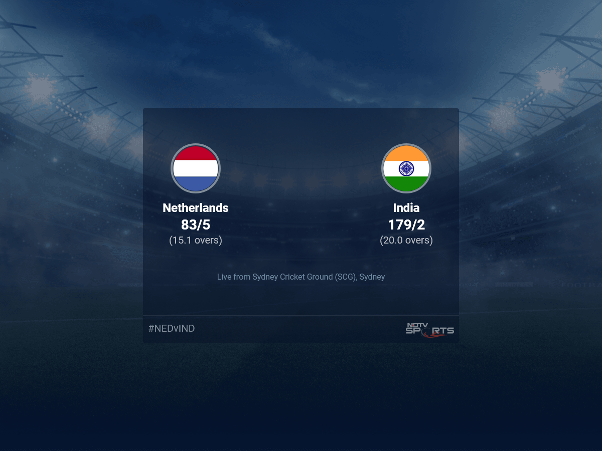 Follow the ICC T20 World Cup 2022 live cricket score on Sports.NDTV.com. After 15.1 overs, Netherlands, chasing a target of 180, are 83/5. Get live score, ball by ball commentary and much more. Keep track of ICC T20 World Cup 2022 today match between Netherlands and India. Everything related to Netherlands and India match will be available on Sports.NDTV.com. Stay updated with Netherlands vs India live score. Do check for Netherlands vs India scorecard. You can get scorecard updates, match related facts. Get quick live updates with ads, Sports.NDTV.com, which is the perfect destination for live cricket score.