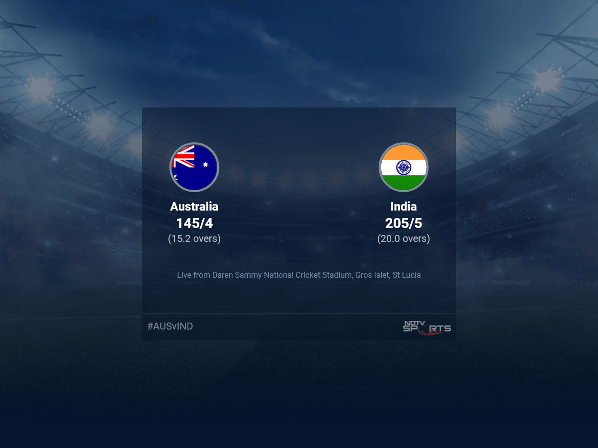 Follow the ICC T20 World Cup 2024 live cricket score on Sports.NDTV.com. After 15.2 overs, Australia, chasing a target of 206, are 145/4. Get live score, ball by ball commentary and much more. Keep track of ICC T20 World Cup 2024 today match between Australia and India. Everything related to Australia and India match will be available on Sports.NDTV.com. Stay updated with Australia vs India live score. Do check for Australia vs India scorecard. You can get scorecard updates, match related facts. Get quick live updates with ads, Sports.NDTV.com, which is the perfect destination for live cricket score.