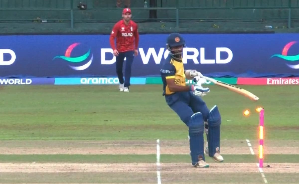 Sri Lankan all-rounder Dushan Hemantha suffered a bizarre hit-wicket dismissal during the T20 World Cup 2026 Super 8 clash against England in Kandy this Sunday. Chasing 147, the incident occurred on the final ball of the 12th over when Hemantha, attempting a pull shot off Jamie Overton's delivery, lost his grip. In a moment of dramatic misfortune, his bat flew out of his hands and crashed into the stumps. The unusual dismissal instantly went viral on social media, marking a dark turning point for the co-hosts. The freak accident sparked a panicked lower-order collapse, as Sri Lanka crumbled from a competitive position to be eventually bowled out for just 95.