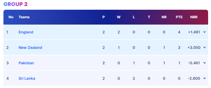 Scenario 1: If Pakistan beat Sri Lanka, it will also hope England to beat New Zealand, and Sri Lanka to defeat New Zealand as well. In that case, the points table will read: Pakistan (3), Sri Lanka (2), New Zealand (1). Pakistan will then qualify for the semi-finals as the second-best team from Group 2.