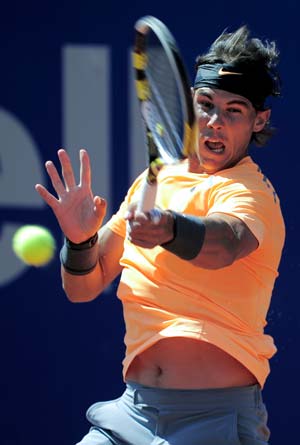 Rafael Nadal served up back-to-back finishing aces on Friday as the Spaniard's claycourt juggernaut headed closer to a seventh title at the Barcelona Open with a 6-2, 6-2 thrashing of Janko Tipsarevic.