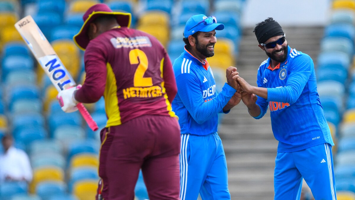 Kyle Mayers wanted to free himself and only managed a slog that went to skipper Rohit Sharma at mid-on while Jadeja timed his jump to perfection at point to latch on to an Alick Athanaze (22 off 18 balls) slash after a brief but adventurous stay at the crease.