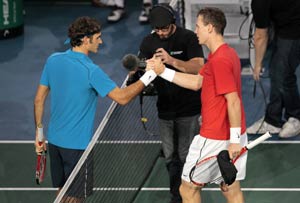 Federer improved to 10-4 against Berdych, who had won their last meeting in straight sets at the Cincinnati quarterfinals in August by attacking Federer's second serve. He got few chances this time, as Federer made 70 percent of first serves.