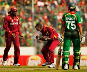 Mohammad Ashraful confirmed the quality and trustworthiness of the surface with two elegant fours in his 21-ball stay - a drive through the covers and a fierce cut through point - but Roach's extra pace once again made the difference, as Ashraful wafted the first ball of his sixth over to the keeper. Naeem Islam, by this stage, had also been and gone, beaten by Benn's extra bounce to poke another catch to the keeper.