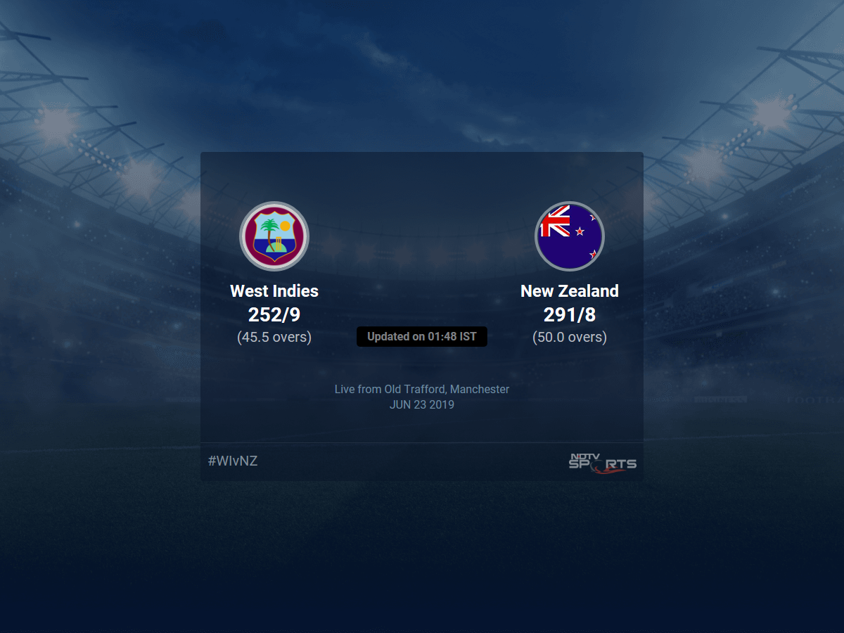 Live Updates of Today Match between West Indies vs New Zealand from Old Trafford, Manchester. Check commentary and full scoreboard of the match.